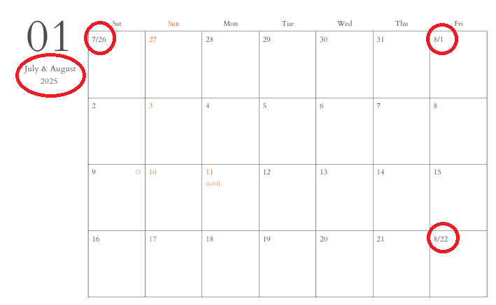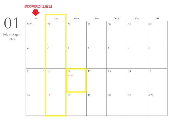 2025年7月26日を新年の1日目とすると、、カレンダーの一番左側が土曜日になります。
